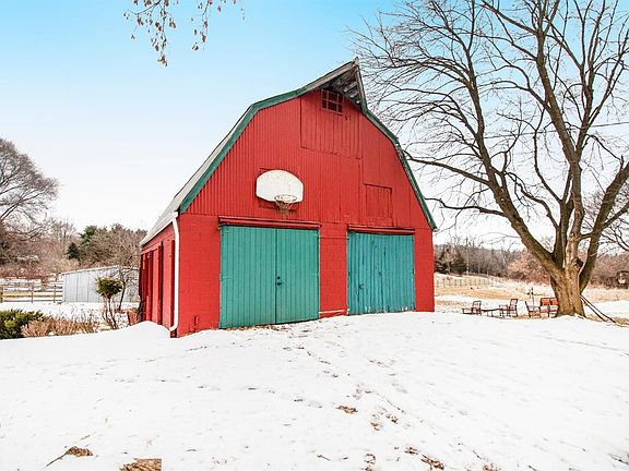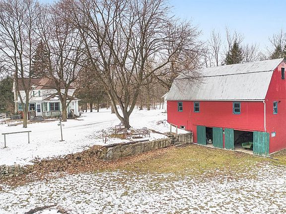 Turn-of-the-century farmhouse on 4.36 beautiful acres. Low-maintenance vinyl & stucco exterior also boasts a composite tiered deck off the back and stately front porch. The side yard is fenced and perfect for dogs or a play-set. Inside features a full bath on the entry level, large eat-in kitchen, ample formal dining room that opens to a sun porch, and living-room with a fireplace and wood stove insert. Upstairs is another full bath, 2 bedrooms, and an expanded master bedroom with separate dressing area or office and second set of stairs to the entry level. The full basement is unfinished with a tremendous amount of storage space. Outside features a beautiful cement block barn with metal roof and huge hayloft. Solid and perfect for housing animals or for hobbies and storage. The barn's lower level was used as a pottery studio. Separate horse barn with 4 stalls, corn crib, and fenced pasture. Adorable former granary building by the driveway was converted into a children's playhouse and could also be a wonderful potting shed or chicken coop. Also being offered at $425,000 with the adjacent lot behind property for an additional 4.04 acres.