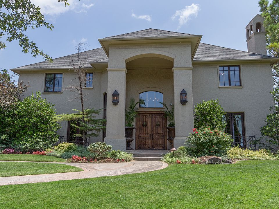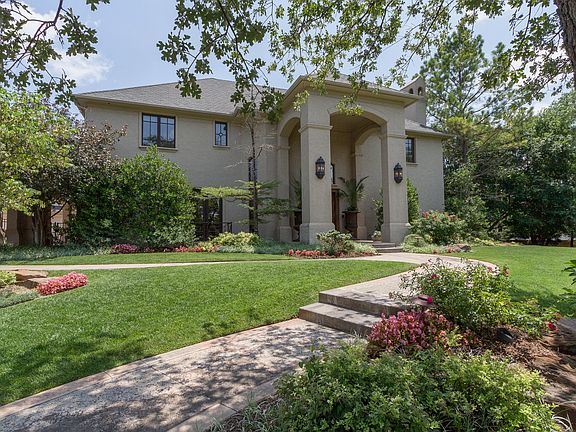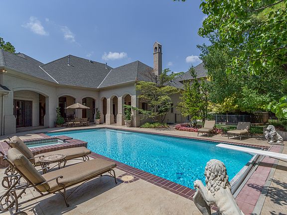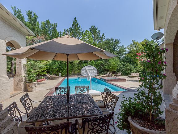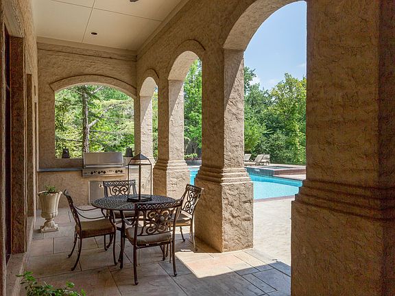 Soaring ceilings in entry with beautiful inlaid floor pattern. Formal dining with barrel vault ceiling and lots of natural light. Stone columns add detail to the open floor plan. Kitchen with island and eating area, built-in desk and nice flow into family room. Master suite with pool views and nearby exercise room. Separate staricase to private guest quarters or additional living space with theatre, guest bed, full bath, kitchen & living area.