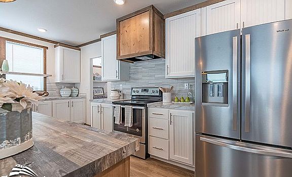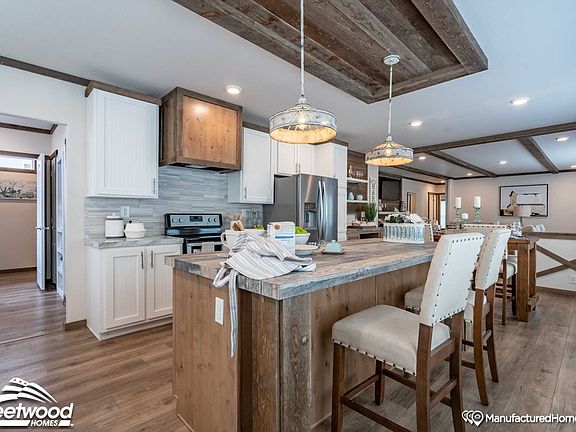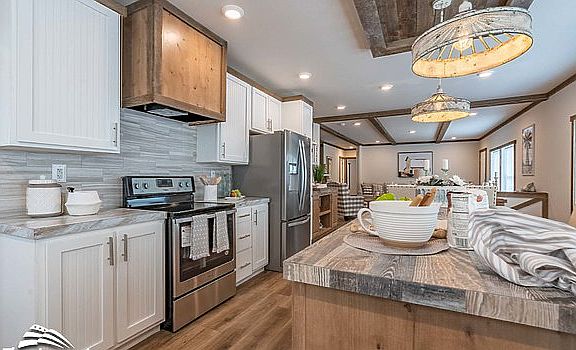 30603F The Clover / Beautifully crafted farmhouse style family home features extra large living room open to bright modern country style front kitchen with six windows allowing natural light to permeate the entire area, large centerpiece island, lots of handcrafted cabinets and countertop space, adjoining desk area with large pantry and separate laundry area with freezer space, luxurious master bedroom with ensuite featuring large freestanding soaking tub, separate stall shower, "his" and "hers" sinks, and extra large walk-in closet, kingsize guest bedrooms with walk-in closets and roomy guest bath.