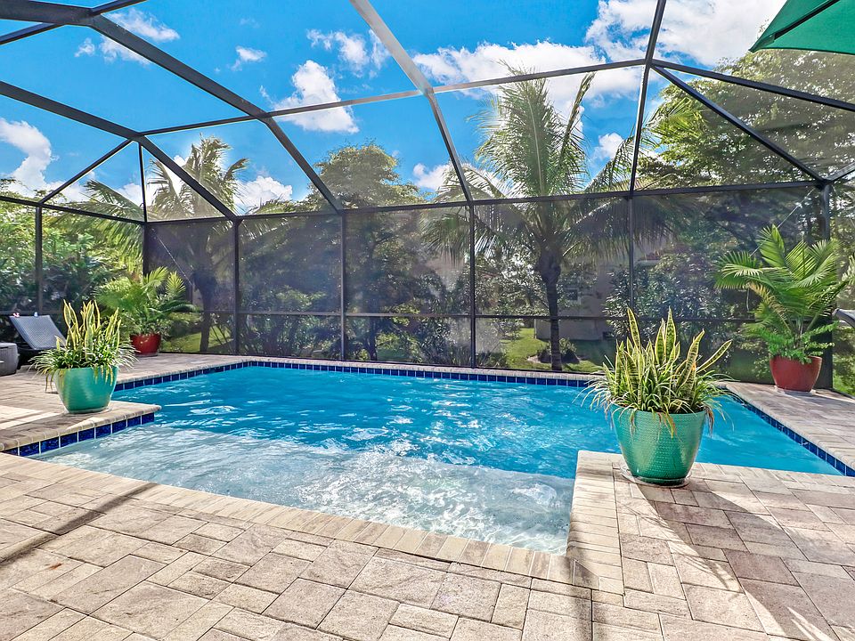 Custom Pool, large lanai, lush landscaped private culdesac pie wedge size lot, invisible fence for pets. 3 beds, 2 full baths, with den. Upgrades throughout are stylishly barn door to secondary bedrooms , beautiful expresso cabinets, diagonal tile throughout main living, iron glass front door, crown molding & trimwork in Trey ceilings, screened front porch to enjoy sea breezes, newly tiled bedrooms, cabinets in laundry, stainless steel appliances, epoxy garage floor, plus closet organizers in master closets.
