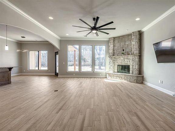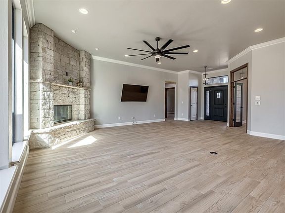 Remarkable, gated 5-acre estate! This property features mature trees, a private pond and endless possibilities. 3 bedrooms, 2 bathrooms + an office! Interior updates include: wood tile flooring and paint throughout, light fixtures, dishwasher, stone fireplace, baseboards & electrical outlets. Exterior updates include: Sprinklers, sod and 450ft of paved road leading to the property from Triple X! Expansive living room windows give tons of natural light and an unparalleled view of the beautiful private homestead! Kitchen features an 8ft island, cooktop, built in oven and microwave, granite countertops and ample storage. The primary ensuite offers dual sinks, walk in shower, jetted bathtub & walk in closet with built ins. 8-10 person storm shelter located on the west side of the property, plenty of room for a pool and/or shop! Well & septic on the property.