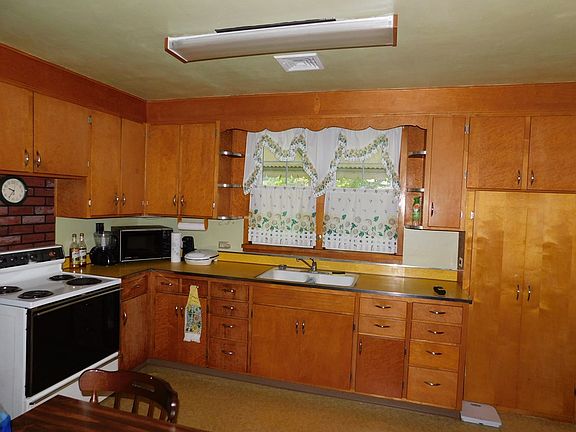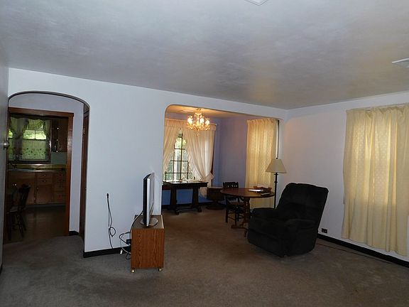 2 bedroom brick ranch on 0.39 acre corner lot with living room, dining room, kitchen and laundry/utility room 2 car garage with workshop, off street parking, oil furnace with radiant floor heat. View of the mountains and fields off the covered back patio. Garage roof has a leak on one side.