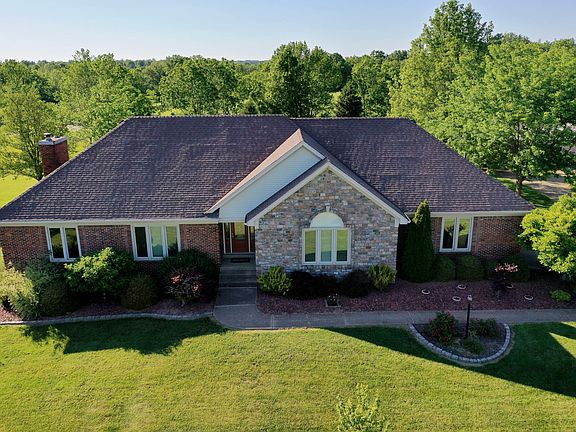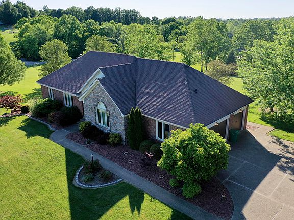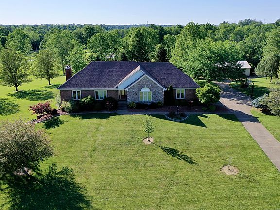 Welcome to Derbyshire in Fisherville and enjoy your 5.386 acre lot on private cul-de-sac. This brick with stone accent walk out ranch has so much to offer. With over 4,000 total square feet and open floor plan, you will find a large sun-filled eat-in kitchen, dining area and great room with cathedral ceiling and gas log fireplace. The dining area and great room both have patio doors to access the massive deck overlooking the beautiful acreage. The master bedroom has soaring ceiling, walk in closet, plus an additional double door closet, and beautiful arched windows with plantation shades. There is private master bath with soaking tub and standup shower. Two additional bedrooms with walk-in closets and hardwood floors and full guest bath complement the upper level. Downstairs in the walk-out lower level, you will find a huge family area with gas log fireplace and patio doors leading to the private lower level patio with hot tub. Also downstairs you'll enjoy a full kitchenette, two additional rooms, one currently used as a bedroom with walk-in closet that conveniently adjoins a full bath, and another room with closet that is currently being used as a work-out room. There is a 3 car attached garage with updated garage doors and yet another 5-car detached garage! The seller is also offering a one-year HSA warranty. Don't miss this gem! Listing Agent is related to the sellers.