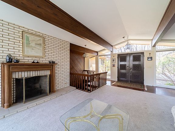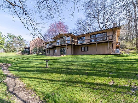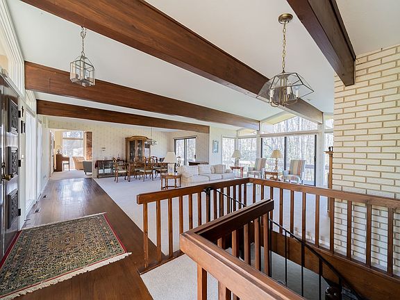 This Mid Century Modern Style Ranch is Located in Beautiful Knollwood Boasting a Flare of Contemporary Design. Arriving you are Greeted with a Grand Double Door Entry that opens into a Multiple Beamed Vaulted Ceiling Flowing throughout the Formal Living Room and Formal Dinning Room, Wrapped in Full Length Windows and Sliding Doors-Ceiling to Floor. This space is Flooded with Light and Seasonal Views of the Garden just beginning to Bloom. The home has 3 Full Baths (2 Ensuites), a Half Bath off the ML Laundry and potentially 6 Bedrooms! Presently the Master EnSuite includes a Full Wall of Windows/Sliding Doors to the Wrap Around Deck, French Doors into the Dressing Area complete with Double Vanity, Walk in Closet, Ceramic Floor in the Private Bath with Pedestal Sink and Double Glass Doors on a Double Size Tiled Shower. The Master Bed Room flows into the Open 2nd Bed Room with a Large Walk in Closet, presently used as and Office/Reading Space. great Feature is the Large Great Room with the 2nd Fireplace and a Mirrored Shelving in the Wet Bar, just off the Spacious Kitchen and Breakfast Nook. Completing the Kitchen with Oak Cabinetry, Double Oven/Microwave, Cooktop, Refrigerator and Sliding Doors allowing more Light to flow throughout. The Full Finished Lower Level Walkout includes: 3 Bed Rooms(one with French Doors used as a Large Office), Great Room with a 3rd Fireplace and LOTS of Storage in 3 Unfinished spaces, plus an Open Railed Back Staircase up to the ML Laundry/Side Service Door/Garage. The Laundry Space has 2 Closets, a Wall of Cabinets, a Utility Sink and the Half Bath just off the hall.The Garage with Professionally Finished Pebblestone Treated Floor and More Storage would be a great space for a Workshop. This is one home you don't want to miss.