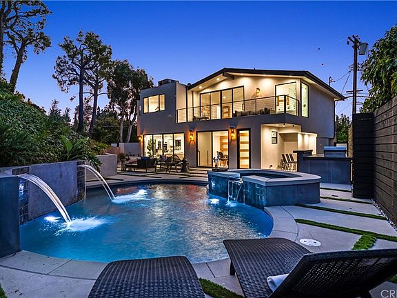 Situated on almost half an acre of land in the prestigious and highly desirable Encino South of the Blvd community, this contemporary home is the perfect blend of warmth and style. This stunning home featuring 5 spacious en-suite bedrooms has been upgraded and completely renovated w/ designer finishes and custom cabinetry throughout. The oversized custom oak front door swivels w/ ease into an exceptionally open and bright floor plan. Glass sliders open up to your peaceful private yard oasis featuring a waterfall pool and spa as well as an outdoor bar with built-in barbecue area. Wide plank oak floors, balconies with expansive views, & Venetian plaster glow. Modern and sleek kitchen with high end stainless steel appliances including two ovens and a six burner stove. Grand master suite includes a walk-in closet, luxury bathroom w/ a double vanity & soaking tub, private deck and canyon views. Incredible location just minutes from all of the shopping and restaurants on Ventura Blvd., major freeways, & top rated K-12 private schools such as Buckley, Stratford, Saint Francis, & Waldorf. Top rated K-5 Lanai Road Elementary public school. This home checks all of the boxes.