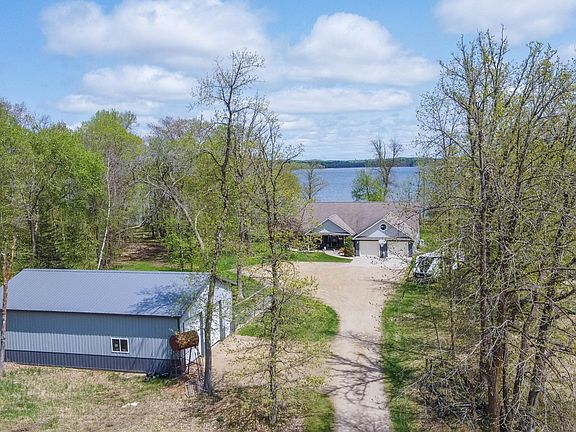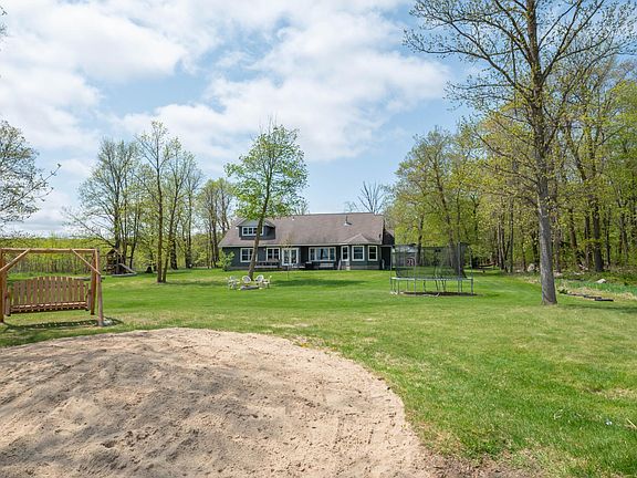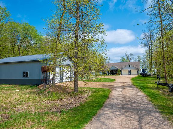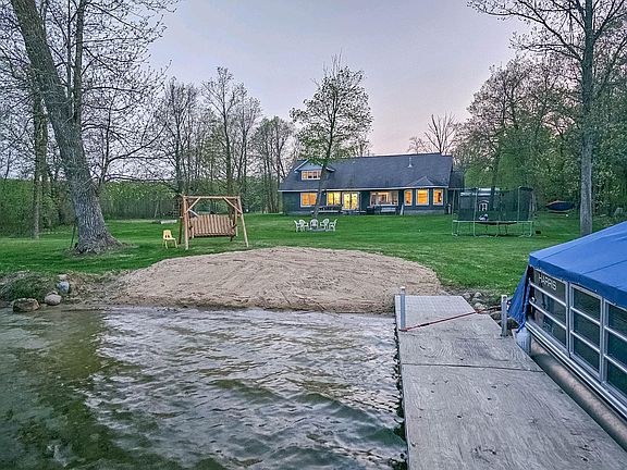 Jaw dropping, beautiful 5BR 4BA home on a gorgeous level lot on Wolf Lake. This private, 2.5ac lot has mature trees, great views, wildlife galore, and is level down to the water's edge. Impressive 2004 home has a new kitchen w/ quartz countertops & dreamy white cabinets, stainless appliances and thoughful designs. Vaulted living room features a dual-sided gas fireplace and great views of the lake. Main level en-suite w/ jetted tub and walk in closet. Comfortable in-floor heat & heat pump heating/ac keeping the utility bills low. Possible 5th bedroom or rec room upstairs along with the 4th bath & bonus room storage is well thought out. Newer 32x48 pole building w/ 12' sidewalls for the storage needs. Walk down to the sandy beachfront to hop on the pontoon or relax by the firepit, you'll find a quiet, peaceful setting here.