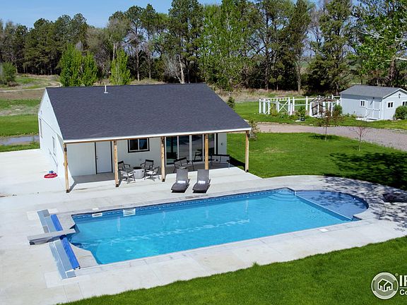 Stunning and Unique Property!! Over 5 acres with 4 bedroom, 4 bath home with outdoor pool. Included 3.8 district acres of Bijou Water and Well allow for irrigation of mature landscaping and garden. Main floor features hard wood floors, large open kitchen with granite counters, casual and formal dining room and dumbwaiter. Upstairs includes large primary bedroom with 5-piece bathroom, including jetted tub, walk-in closet and private outdoor deck. 2 additional bedrooms upstairs with loft areas and Jack and Jill bathroom with heated marble flooring. Basement has additional bedroom with attached full bathroom, office/study room, exercise room and family room. Amazing 3 bay garage with space for 5+ vehicles and overhead storage. Pool house features a kitchenette, 3/4 bathroom and rec area. 8 foot deep vinyl lined and solar heated pool with fiberglass tanning ledge. Storage building with attached chicken coop and dog run. Must see to fully appreciate...too many additional amenities to list.
