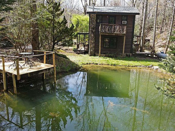 This cabin is the perfect getaway with unrestricted flat land, a pond and Hemptown Creek flowing through the length of the property. Walk through the front door to the great room and kitchen / dining area where you can hear the creek flowing while making dinner or relaxing. The bathroom and laundry are down the hall from the kitchen area. Past that is the main floor bedroom currently setup with a couple bunk beds. The owners suite is upstairs with a private porch overlooking the pond. There are multiple outbuildings for a workshop, storage, man cave or she shed. One of them has a woodburning stove and a fireplace. The cabin comes turnkey with the exception of the dining room table (which is negotiable). This can be where your family dreams come true. Would also make a great short term rental.