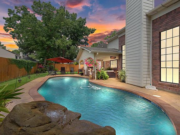Absolutely stunning home with sparkling pool! No detail has been overlooked in this recently updated home. Entry with travertine tile flooring and a soaring ceiling w/ custom light fixture. Engineered hardwood flooring throughout the den, living, living room, and dining room. Updated kitchen with XL island, travertine floors, granite countertops, marble tile backsplash, stainless appliances, and a huge picture window with amazing views of the pool and backyard! XL Primary suite and Primary Bath featuring dual sinks, garden tub, and walk-in shower that has recently been remodeled with seamless glass enclosure! The second floor features 3 spacious bedrooms and a retreat/study area. Upstairs bath recently remodeled with new tile surround and glass enclosure. Recent HVAC replacement (7/2020). This incredible backyard features a cool, sparkling pool to cool of in, huge, covered outdoor living area, and outdoor kitchen w/ granite tops and sink! This one won't last long!