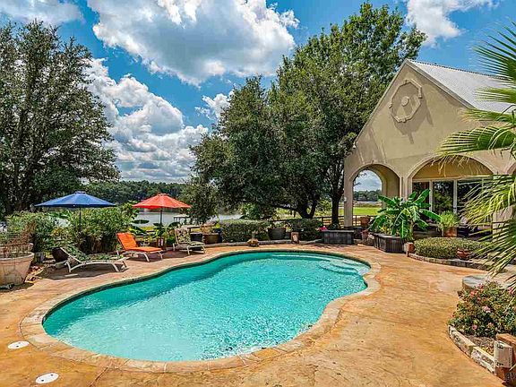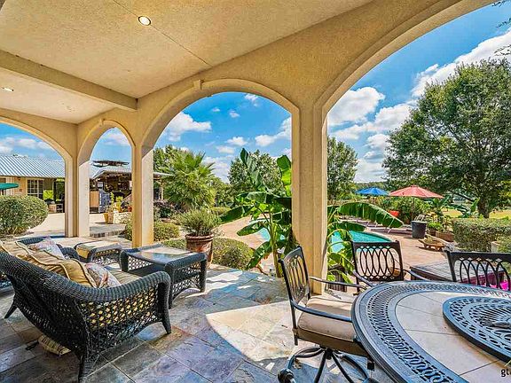 SPECTACULAR 6800sqft LUXURY HOME ON 20+- AC ON LAKE PALESTINE! With 3800ft of frontage on the incredible fishing lake, property features 4-5 Main Home, 100x50 workshop w elect &1500 sqft 3-2 office-guest home, 75x50 shop w elect &AC w 50x30 covered parking &1200 sqft apartment,outdoor commercial kitchen& entertainment area w pool,Grand gated entrance, concrete drive w tons of parking, approx 10 ac Upper Neches River Authority lease-back,dock,boat ramp,stocked pond,& high quality hay pasture. Main Home features spacious rooms&living areas,fully loaded Chefs kitchen,2nd master,& luxury master suite overlooking pool&lake with enormous closets,two bathrooms,2nd utility room & oversized custom shower+so much MORE! Excludes: Potential Turnkey Property- Furniture and personal property negotiable.