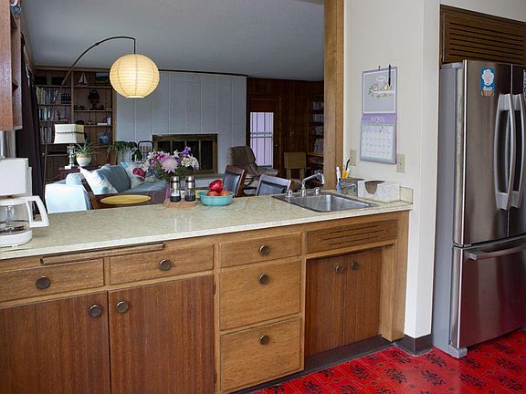 Reminiscent of a Frank Lloyd Wright Home. 3 bedroom, 3 bath,, book shelves galore to display your favorite collectables, books and etc. Fireplace. Large master bedroom with built in desk. Updated master bath and newer bedroom in the basement. Newer appliances.