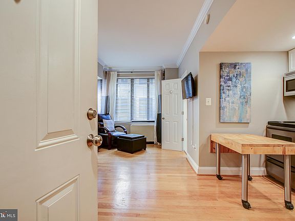 Stunning, light soaked pied a terre with an open concept interior located in the heart of Dupont Circle. This efficiency unit boasts a courtyard side exposure, stainless steel appliances, crown molding, a built-in microwave, granite countertops, large custom double closet with organizational shelving, Murphy bed with built-in shelving units, and a wall mounted tv. The bathroom includes beautiful ceramic tile and custom tile work throughout providing a modern and luxurious bath setting. Recently repainted interior and upgraded painting of the closet, kitchen, and Murphy bed cabinetry and shelving units. Walkable to the 17th Street Corridor and to Dupont Circle Metro and the local shops and restaurants. The Cable & internet services are included in the cooperative fee and the amenity rich building provides a calming all-inclusive home setting for individual lifestyle needs. There is a fitness center, roof deck, banquet room, and a large den for business or personal use on site. Also included are bike storage, additional storage options for personal items, and a full service concierge.