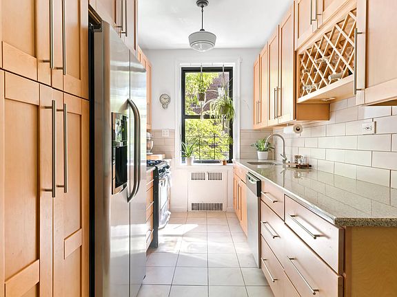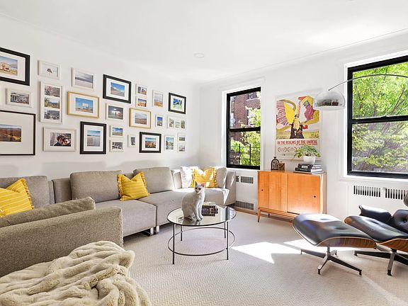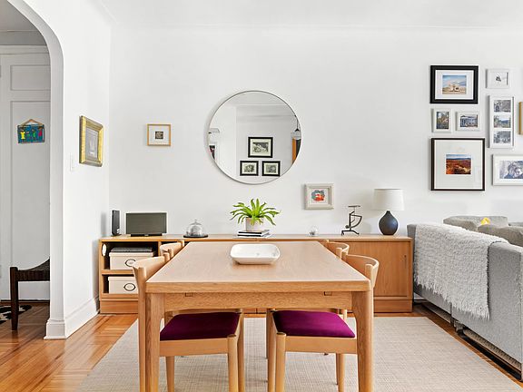 This bright and expansive pre-war two-bedroom, two-bathroom apartment in a popular pet-friendly co-op on a quiet block has a house-like layout and is convertible to a still-spacious three-bedroom home. It's a move-in ready corner unit in the largest line in the building, and it has a multitude of fantastic features such as leafy views of a tree-lined Brooklyn street, graceful arched entryways, original oak flooring throughout, a washer/dryer, soundproofed apartment above, eastern and southern exposures, and eleven windows that let the light pour in! A home like this rarely comes on the market. This is a must-see! Enter into a gracious foyer that has two closets and is more than big enough for a home office or formal dining table. From here, enter into a huge sunny living room that can easily accommodate both a living and dining area. Opening onto this space is a roomy, remodeled proper eat-in kitchen with a dining nook, charming inset wood-framed chalkboard, built-in wine rack, granite countertops, a dishwasher, and lots of storage and cabinet space. Down a hallway, nicely separated from the living space, are two massive sunny bedrooms that each have two exposures and two double-deep closets. The primary bedroom has a windowed ensuite updated full bathroom. Also on the hallway is a second updated full bath that is windowed and pretty. Berkeley Square is a sought-after art deco co-op with exceedingly strong financials, no underlying mortgage, large reserves, and affordable maintenance. The building has three full-time doormen, a live-in super, a full-time porter, a bike room, a well-designed common outdoor space, extra storage available for rent (possible waitlist), and parking in a secure adjacent lot for $75/month (waitlist). Close to Prospect Park, the B and Q trains, the revamped Kings Theatre, and all the amenities of Church Avenue and Cortelyou Road, including the year-round Cortelyou farmer's market. It's also less than a mile from the new Kensington dog run.