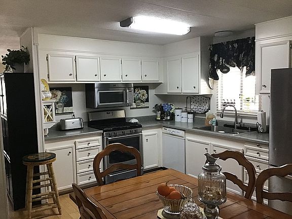 Beautiful manufactured homes 1440 ft. 1977 Pergo wood flooring, new roof December 2021. Newer stainless steel gas stove and microwave. Home was updated in 2018. Home has been completely painted inside no dark paneling. Two large sheds. Wheelchair accessible. Laundry room, master bath with soaking tub. One of the largest lots in the park with drip. Space rent is $575 a month which includes water, trash and sewer. 55+ park. Large clubhouse with pool. Gated and well lit at night. 15 ft of custom floor to ceiling cabinets in spare bedroom. Refrigerator Heating and cooling. Buyer to be approved by the park, being sold as is. Nice open floor plan. Home back on the market at no fault of seller or the home. Needing to sell due to work. Newer Refrigerator, washer and dryer ca be purchased