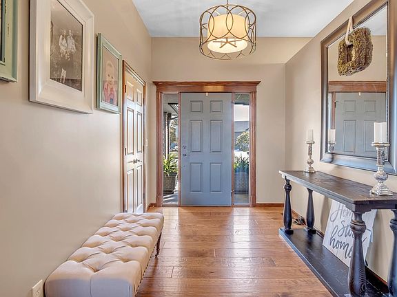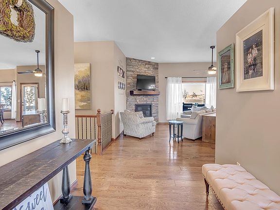 Sand Creek Station FAIRWAY PROPERTY WITH NO SPECIAL TAXES!!*** Gorgeous home located on the 17th fairway with panoramic views of the 16th and 18th holes as well. The open floor plan of this custom home is fantastic. Hardwood floors throughout the main floor. Vaulted ceilings. A modern stone gas fireplace anchors the living area to the kitchen and outdoor space. Large floor to ceiling windows let in wonderful natural light. Kitchen with peninsula and eating bar, granite countertops, pull outs, stainless steel appliances, gorgeous light fixtures, neat details such as corner garage for hidden counter appliances, glass block lighting built into the back splash, upper accent lighting and cabinets with variated heights and accent color. The dining space will easily seat 8, plus additional bar space seating. You will love the built-in bookcase wall! A beautiful accent! The primary suite includes a cove ceiling with accent lighting, private access to the exterior deck, a lovely bath with double vanity, large walk-in shower, storage, jetted tub, and walk in closet with seasonal storage. Two additional bedrooms complete the main floor, one currently serving as the perfect office space. The basement is fully finished. View out windows with a walk out to the back yard. Huge rec room space with plenty of room for a game area. The full wet bar includes a wine fridge and ice maker. You also have a stone gas fireplace along with a built-in entertainment center including floor to ceiling shelving on both sides. A fourth and fifth bedroom along with a full bath finish off the basement space. Plenty of storage here too! Entertaining would be a breeze when you step out to the backyard. Huge stone patios, and an oversized deck, beautiful landscaping, sprinkler system and irrigation well, along with the exceptional views of the fairways. You can also enjoy the neighborhood amenities with walking paths, neighborhood swimming pool and area lakes. Easy access to the highway for commuters. Near shopping, hospital, and local YMCA.