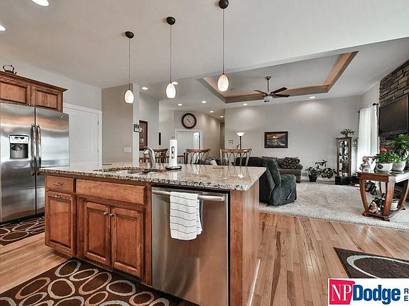 Absolutely wonderful and well-maintained ranch in Hawk Ridge! This home has an open floor plan with 10' ceilings throughout and is ideal for the entertaining enthusiast. The kitchen offers granite counters, stainless appliances, a center island, a roomy dining area, a huge walk in pantry and gorgeous hardwood flooring! The living room features a custom tray ceiling with recessed lighting and gas fireplace. You'll love the large master bedroom with recessed decorative lighting and a luxury master bath with a dual sink vanity, whirlpool tub and walk in closet. Main floor laundry here! Fantastic, fully fenced backyard with a massive covered patio area, perfect for warm weather gatherings. The lower level has been sheet rocked, has egress windows and awaits your finishing touches for more livable space. Cul-de-sac location and Service One Warranty is included. Quick access to Hwy 75 for shopping, schools and recreation. Take a look today!