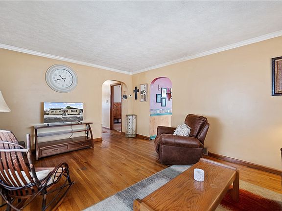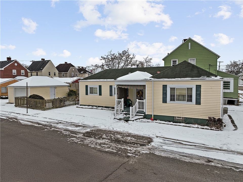 Opportunity abounds in this cozy two Bedroom, one-level home. It offers eight foot ceilings and original hardwood flooring waiting to be restored. Plenty of living space in the generously sized Living Room and well equipped, spacious Eat-In-Kitchen. Minutes to 376 and Pittsburgh Airport. Well suited for investment, first time buyer and downsizers. It offers a small, fenced yard and oversized detached garage on a corner lot. A covered porch with awnings allows for shaded fresh air! A comfortable living experience inside and out. A manageable layout, good storage and an unfinished basement with potential for additional living space. Ideal if you value simplicity and easy living.