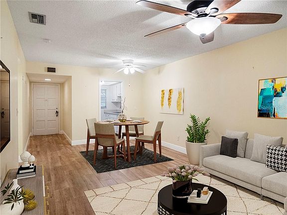 Pinehurst Village of Dunedin, Florida. A very desirable 55+ community in Pinellas County. Known for its well manicured grounds, amazing clubhouse with a multitude of social activities, beautiful pool area, grilling/BBQ area and you can't beat the location!! A few blocks away from Hammock Park, the Dunedin Community Center, the Gulf of Mexico and a 5 minute drive to HoneyMoon Island as well as downtown Dunedin. It doesn't get much better than this when it comes to Dunedin Villas. When arriving at this Villa like condo, you'll park under your covered parking space, just a few steps away from your front door where the magic all begins!! Immediately as you walk in you'll notice the care and attention that the seller has put into this space along with a multitude of updates: wide wood plank ceramic tile throughout, new 6" baseboards, modern/updated ceiling fans, newer vanities in both the master and guest bathroom, remember the old "grid" style lighting? It's all been removed and updated!! Brand new HVAC in 2020, updated electrical panel, newer inside washer & dryer, newer stove and vent hood, overall you'll be impressed with how CLEAN and WELL MAINTAINED this one is!! Besides the beauty and fantastic upkeep of this condo you'll love the floor plan, spacious master bedroom, lots of closets/storage, split floor plan and the kitchen is sizable with plenty of counter space as well as cabinets. Schedule your private experience today and start living the Dunedin Florida lifestyle sooner than later!! Tweety, Nemo and Tom's allowed, no scooby doo's. Virtually staged to assist with envisioning yourself living in this condo.