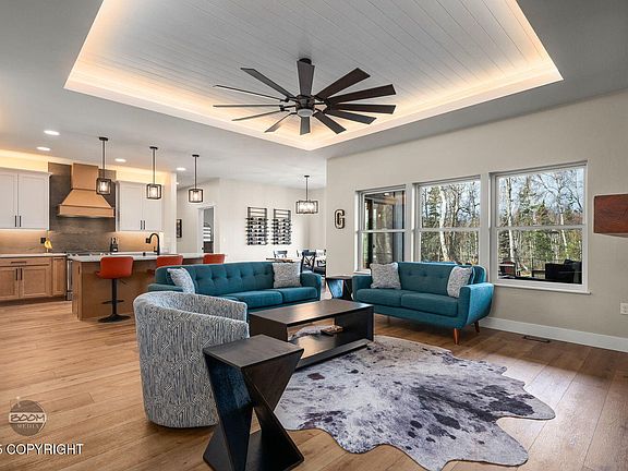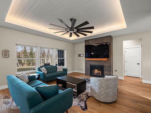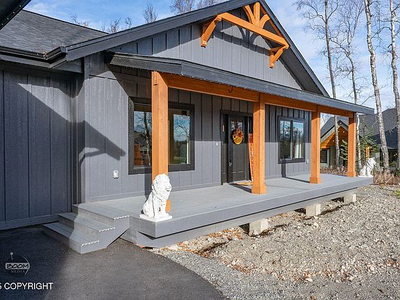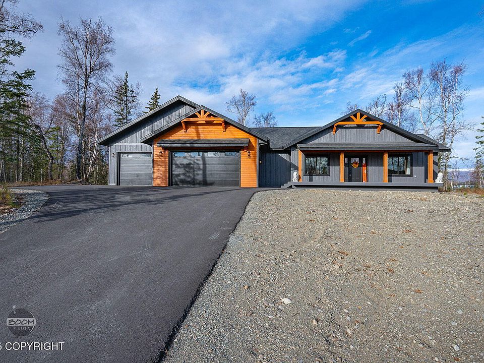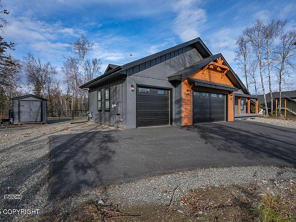 Better than new! This stunning ranch home combines thoughtful upgrades and pristine condition with all the extras already done for you -- including a fully fenced yard, storage shed, and water softener.Featuring 4 spacious bedrooms and 3.5 baths, this home boasts an open great room with 10-ft ceilings, a floor-to-ceiling stone gas fireplace, and doors that open to a covered deck -- perfect forentertaining or simply enjoying peaceful Alaskan evenings. Set on a 1.08-acre wooded homesite backing to 6 acres of open space, you'll love the privacy and natural setting. The primary suite is a true retreat complete with cathedral ceilings and an amazing custom tiled shower! Custom details are found throughout quartz window sills, designer lighting, and beautifully tiled showers. The 831 SF 3-car garage provides abundant space for vehicles, tools, and outdoor gear. Move-in ready, better than new, and perfectly located for those seeking comfort, style, and a little extra elbow room!