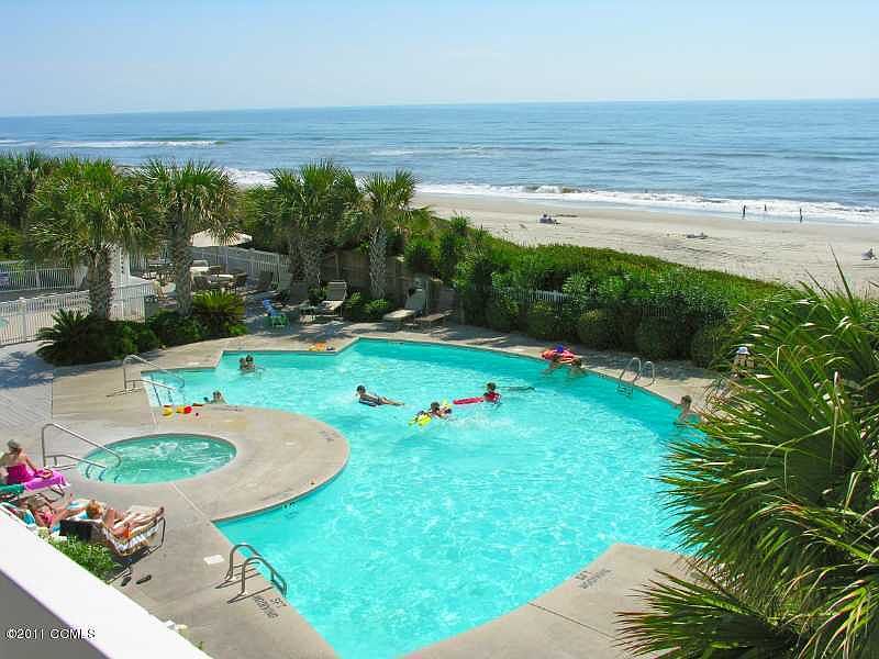 Very nice view of ocean and heated pool from this second floor direct oceanfront condo. Two bedrooms plus den plus livingroom, dining and kitchen. Conveys completely furnished with very few exceptions. Additional amenities pkg available (currently $250/yr.) for tennis, game pavilion,fitness room,putting green, fishing pier, bocce & horseshoes. Appliances: stack w/d