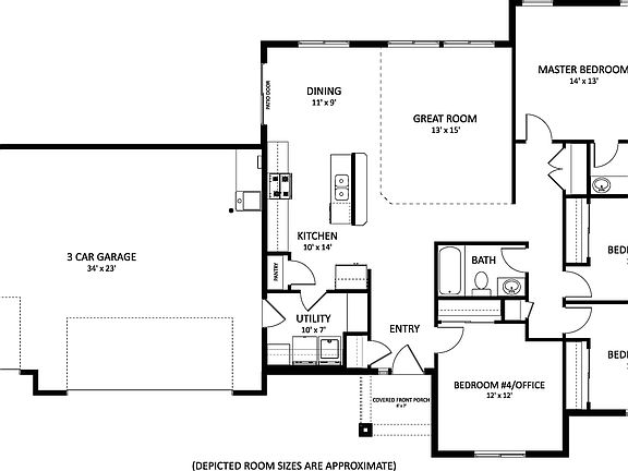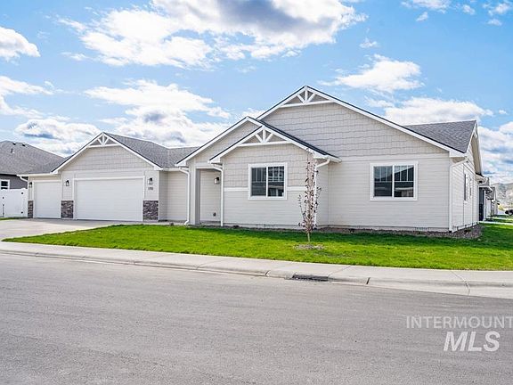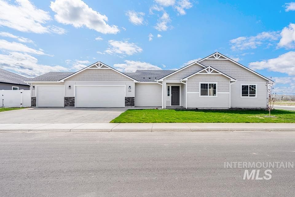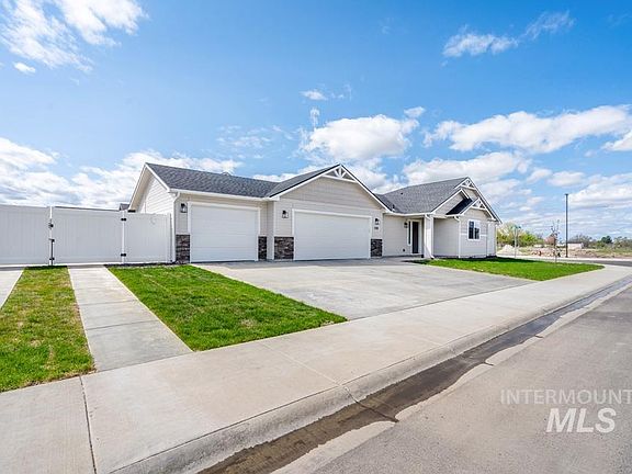 The Bellevue is a 4-bedroom, 2-bathroom home with a 3 car garage. Nestled on a spacious corner lot in the new Dagger Falls Subdivision in Emmett. As you step inside, you'll be greeted by soaring vaulted ceilings & an open-concept floor plan that provides a bright, airy atmosphere. The kitchen features sleek quartz countertops, a full tiled backsplash, a spacious island, ample cabinetry, and SS appliances including a refrigerator. The large pantry ensures you'll have plenty of storage space for all your kitchen needs. Primary suite boasts dual vanities, step in shower, & spacious walk in closet. Step outside to discover the impressive RV parking area with a concrete ribbon approach and a 12-foot RV gate Behind the fence, you’ll find a compacted road mix. Full gutters are included. The front yard comes landscaped with sod, while the rear yard is seeded and ready for you to customize to your liking. Both front and back yards feature full automatic sprinklers. Back yard is fully fenced. Photos Similar.