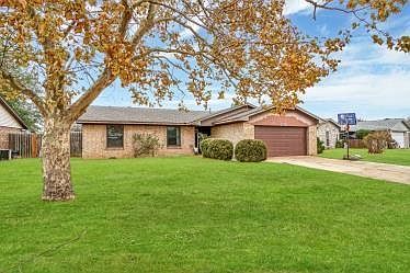 This residence, situated just minutes from Altus AFB, hospital, grocery and shopping areas features a spacious front yard and an inviting entrance. The front windows have been modernized. The interior boasts freshly painted walls and a long entryway that includes two storage closets. The expansive living room boasts a gas fireplace, while the dining area is enhanced by a large bay window and a sliding glass door that opens to the backyard, allowing ample natural light to fill the space. The kitchen is well-equipped with abundant cabinet and counter space complemented by an oversized laundry room. Bedrooms feature laminate flooring and are generously sized with the primary bedroom offering an en suite bathroom. The backyard is designed for enjoyment, featuring a large covered patio, a wood privacy fence, and a storm shelter. This is a must-see!