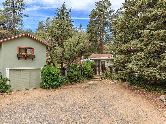 Adorable cottage in the heart of Prescott, is nestled in among tress and boulders for a charming setting for peaceful and easy living. 3 bedroom, 1 bath was built in 1955, but upgraded with HVAC system, newer plumbing, roof and electric, new gas line, recent exterior paint, new hot water heater. Guest cottage above the garage is one bd/1 bath or can be used as a hobby or studio. Extra storage building also contains the laundry facility. Invisible fence for pets and a serene patio for those lazy summer days. Pines and grass add to the character of this lovely home. Must see the sweet charm of this home to appreciate. BACK ON MARKET need to sell. Bring all offers. Reduced price.