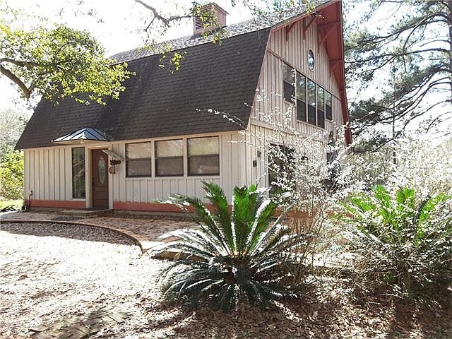 A Beautiful retreat in the country, this home situated near the back of 4.87 acres designed by a Frank Lloyd Wright Fellow, is constructed from Cypress and takes advantage of upstairs living space to enjoy the captivating views. Home is priced to sell with several amenities including exterior generator connections, pond with dock, several sheds, workshop and serene bridge connecting land. Appointment required to show.