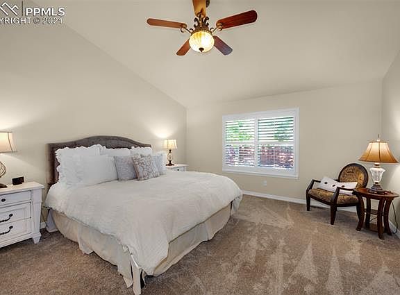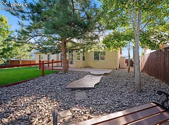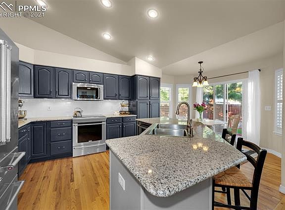 Picture Perfect Rancher in District 38, Super easy access to Denver, the New Santa Fe Regional Trail, I-25 and the Air Force Academy. The driveway features stamped concrete and a 3rd car parking space, both front and back yards are perfectly landscaped, and the home is bright and welcoming as soon as you step inside, with vaulted ceilings and skylights. Hickory wood floors on the main level and custom features throughout. Modern island kitchen features granite countertops and a Whirlpool dishwasher, Electrolux induction/convection range, Electrolux microwave with convection oven, Kitchenaid refrigerator, plus a casual dining area with a walk-out to the backyard and custom patio, great for entertaining. There is also an attractive Formal Dining area. Don't miss the convenient main level laundry room. The master bedroom has new carpet and is spacious with vaulted ceilings, a large walk-in closet and en suite 5 pc bath. There are 2 additional bedrooms on the main level offering space and convenience, with LVP floors. There is also an additional Full Bath on the main floor. In the basement there is shaw carpet and the 2 basement bedrooms both have oversized custom walk-in closets with custom cabinets, and a 3/4 bath which features a quartz countertop, travertine tile in the custom shower which is plumbed and wired for a steamer and has a custom glass shower door that is steam-room ready. There is a large open area in the basement that could be used as a family room, it includes rough-in for wet bar. Also in the basement is a bonus room for exercise equipment or crafts. Convenience of main level laundry and plenty of closet storage space throughout the home. Beautiful Hunter Douglas shutters/blinds, Nest smart-thermostat, a ring doorbell, Central A/C and in-house humidifier all make for a perfectly modern retreat. Class 4 impact resistant roof was installed in 2020. You'll want to see this one right away.