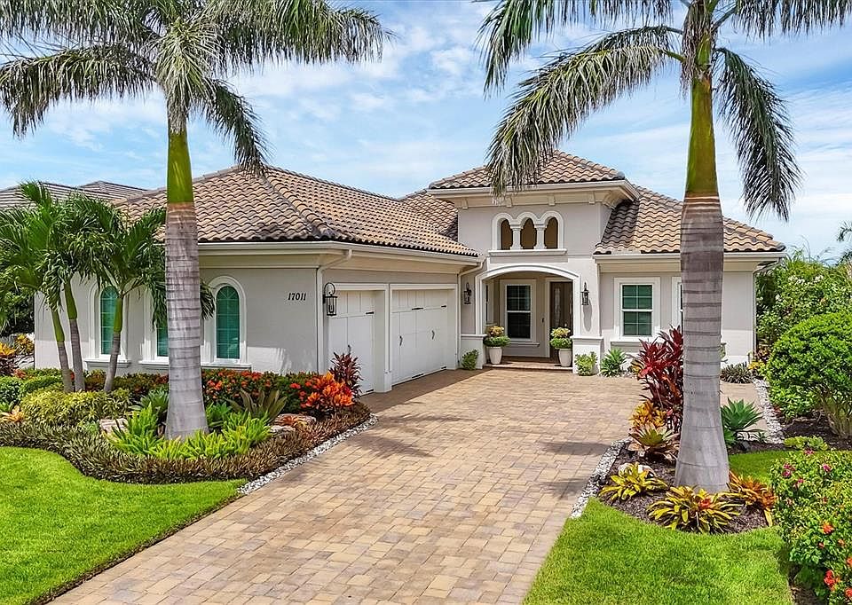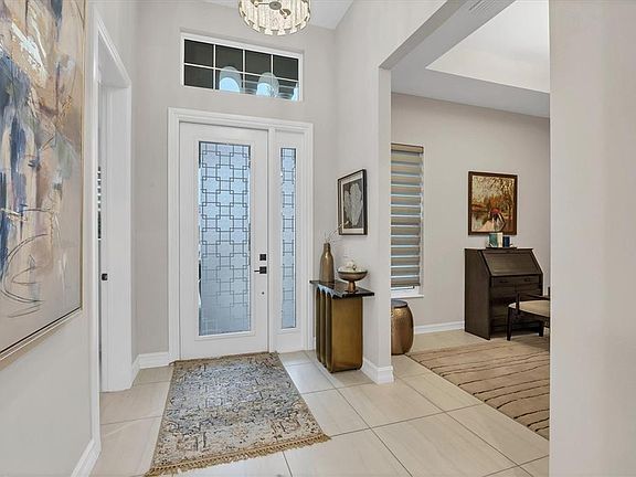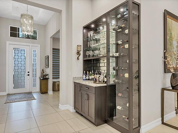 Positioned on a serene lake in the exclusive Lake Club, this beautifully appointed four-bedroom, four-bath plus office home combines luxury design with extensive upgrades for an unparalleled lifestyle. Lush landscaping and welcoming entryway set the tone, opening to a light-filled layout enhanced by designer lighting, custom blinds, 13-foot tray ceilings and sleek porcelain tile throughout. The state-of-the-art, fully custom kitchen is a chef’s dream, featuring custom cabinetry, quartzite countertops, farmhouse sink, pot filler and a 48-inch Fulgor Milano dual fuel range with six gas burners and dual electric ovens. A spacious island provides function and style, ideal for entertaining. Adjacent, the dining area and open great room showcase a striking custom wine bar with quartzite counters, wine refrigerator and dramatic glass cabinet wine wall. The primary suite offers a retreat, with custom dual walk-in closets and a spa-inspired bath complete with dual vanities, a makeup area, oversized walk-in shower and a custom Finnish sauna added in 2023. Two guest suites provide generous accommodations, each with en-suite baths featuring upgraded cabinetry, dual sinks and frameless glass showers. A highlight of the home is the four-season room with 11-foot impact-rated sliding glass walls, allowing effortless transitions between indoor comfort and outdoor living. This space is designed for year-round enjoyment, offering a ribbon fireplace, media wall, outdoor kitchen with flat top grill, professional burner, bar refrigerator, quartzite counters, and its own dedicated air conditioning system. The outdoor oasis, framed by a panoramic screen, is anchored by a saltwater pool added in 2022 with fire features, dual waterfalls and a step-down water element overlooking the lake. Additional features include a three-car garage with epoxy flooring and utility sink, a whole-home water purification system (2021), solid wood interior doors, and sound insulation in key areas. An optional furniture package is also available, making this residence turnkey if desired. As a resident of The Lake Club, you’ll enjoy exclusive amenities including a grand clubhouse with restaurant, resort-style and lounge pools, fitness center, spa services, tennis courts and a playground. This property exemplifies contemporary luxury living, blending modern upgrades with the natural beauty of its lakefront setting.