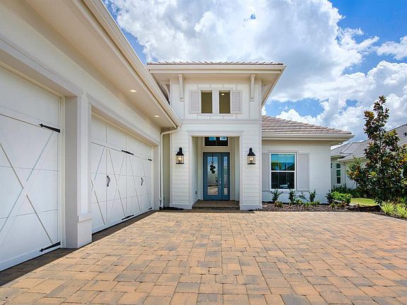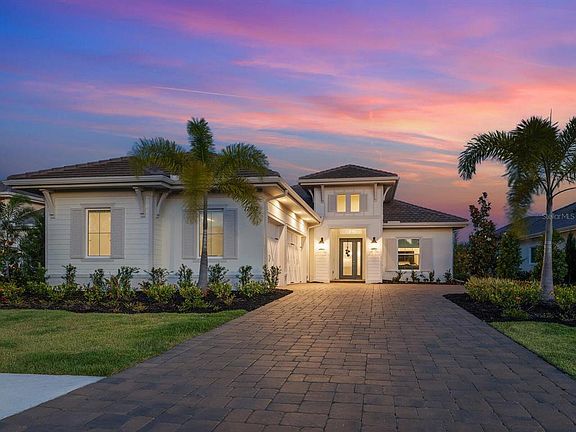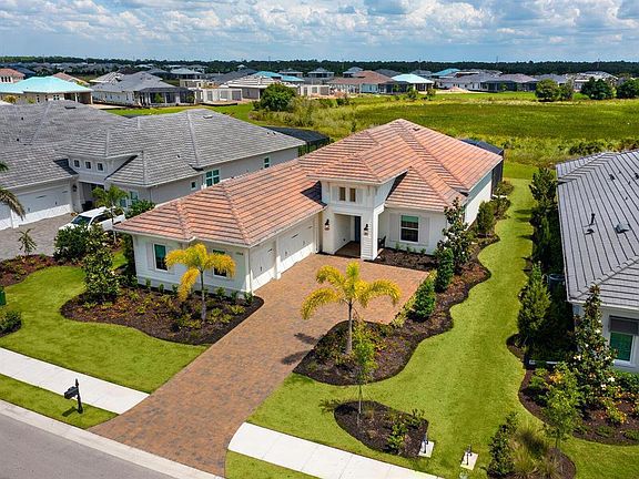 Showcasing simple elegance and sophisticated quality, this coastal contemporary Cambria III home provides idyllic indoor-outdoor living and spaciousness for the life you deserve. Practically brand-new and fully furnished, all your needs are met with high-end finishes and convenience found in a 2021 residence that is move-in ready. Cool blue and vibrant opaque tones create an airy atmosphere that is enhanced with broad windows dressed in custom treatments, wood-look tile floors, high tray ceilings, exquisite fixtures, and timeless décor choices to evoke a sense of luxurious comfort. The open concept floorplan appreciates a split layout, combining the ample great room, dining space and eat-in kitchen. Sliders extend the interiors onto the screened lanai to entertain and relax, featuring a built-in outdoor kitchen, pool and spa overlooking a peaceful preserve setting. The family chef will relish the flexibility of firing up the grill for an alfresco occasion or family-favorite dishes in the custom gourmet kitchen boasting two-tone wood cabinetry, quartz countertops, tile backsplash, stainless appliances including built-in double ovens and gas cooktop, and generous island for gathering. Accommodating diverse needs is a quietly situated den/office with French doors as well as two guest bedrooms and two and one-half guest baths. Apart from the rest of the domains is the owner's suite which presents French doors to the pool and a stunning en-suite bath with dual sinks, a soaking tub and walk-in shower. Completing the picturesque home is a well-equipped laundry room with cabinetry and sink, a three-car garage featuring an epoxy floor, cabinetry with a workstation and shelving for storage, and eye-catching curb appeal of lush landscaping surrounding a brick paver driveway with motor court. The Lake Club is a beautiful, gated community that grants renowned amenities and services including a renovated clubhouse with full-time concierge and activities director, two resort-style heated pools, fine dining, entertainment, a fitness center, spa Har-Tru tennis courts, pickleball, a playground and dog park.