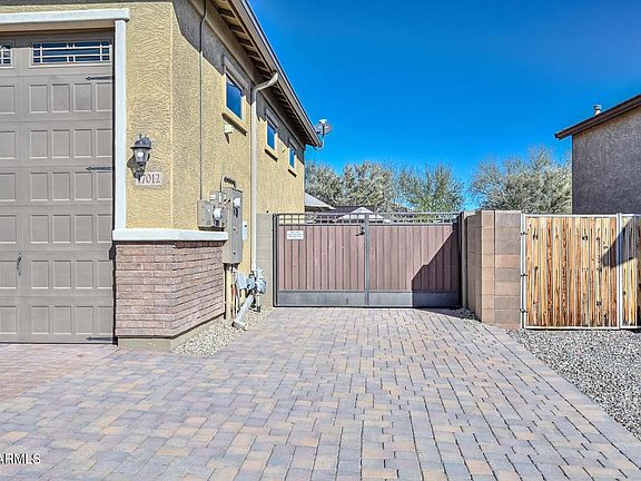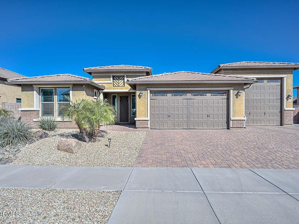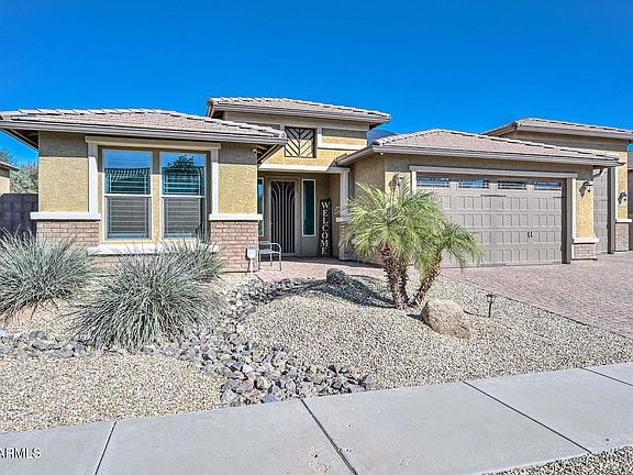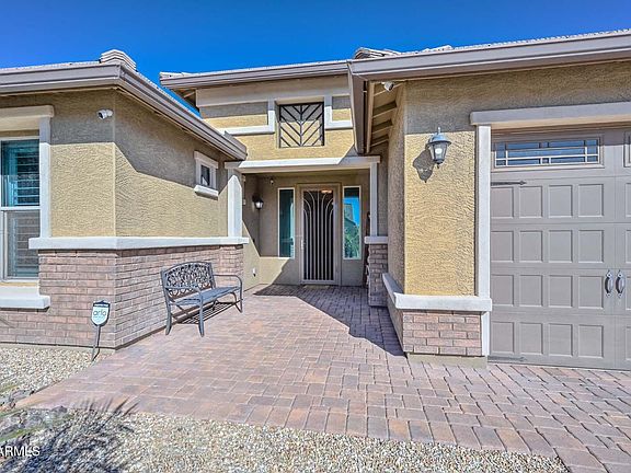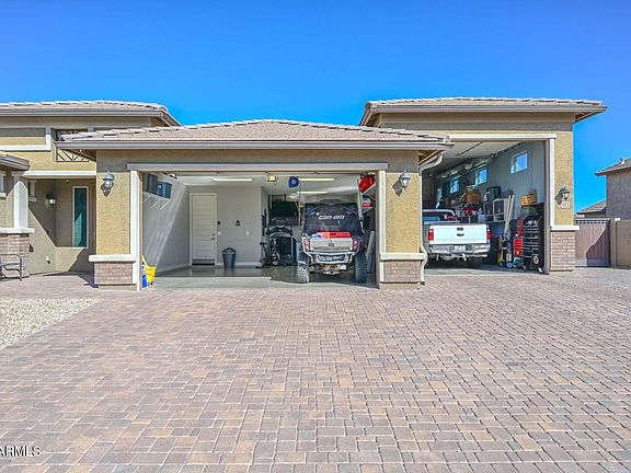 Discover this pristine former model home featuring a 5 car air conditioned RV garage, perfect for a workshop, home gym, studio, and more. Located in the highly sought after Asante community, this upgraded single level gem offers over $100K in enhancements, including a custom pool, widened paver driveway, custom shutters, entire home set up on a soft water system, and a fully paid off 16.92 kW solar system with 20 years of remaining on the warranty. This home boasts exceptionally low utility bills Enjoy resort style living with parks, pools, pickleball, and quick access to shopping, dining, and White Tank Regional Park. Whole-home soft water system & reverse osmosis under kitchen sink.