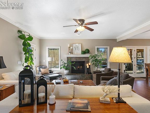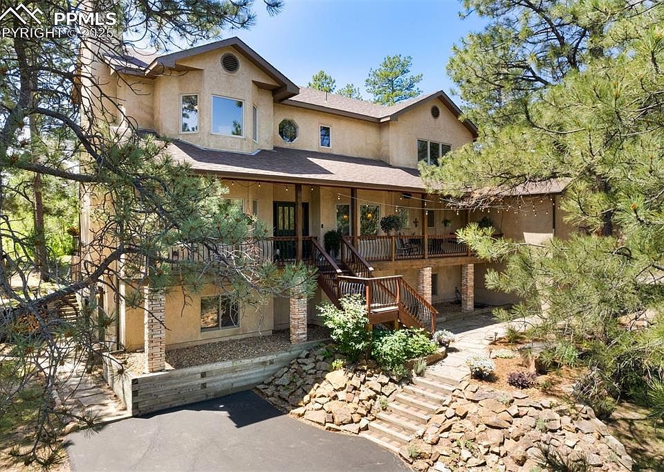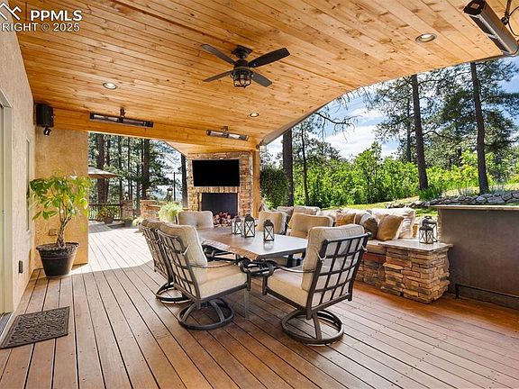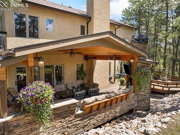 Private, peaceful mountain retreat designed for those who love to entertain, relax, and live with intention. Nestled away from the street on 2.5 acres on the West side of Monument surrounded by nature, and miles of hiking & biking trails in the Pike National Forest; this hidden gem blends thoughtful design with unbeatable outdoor space, all in a location that keeps you connected to everything. The heart of the home lies outdoors in the recently added covered living room for year round comfort with IPE hardwood deck, overhead heating lamps, a gas fireplace, a wood fire pit with igniter, built in Sono's sound system, t.v. and built in Napoleon grill & refrigerator. This home boasts exceptional craftsmanship throughout, including radiant heat, solid hardwood floors & custom Alder doors, crown molding, and custom built-ins. The main level offers a formal dining & living room, a music room, 2 gas fireplaces and an office. The remodeled kitchen is open to the living room featuring two islands, a Thermador 6-burner gas cooktop, granite countertops, a French door refrigerator, and a spacious pantry. Upstairs, the private primary suite offers a peaceful retreat with a spa-like bathroom featuring a custom antique vanity, an oversized walk-in shower, soaking tub, & a private balcony overlooking the treed setting. Three additional bedrooms and 2 bathrooms complete the upper level. The finished basement is a bonus with a custom entertainment wall with built-in surround sound and TV, perfect for movie nights or game day. A wet bar adds to the entertainment appeal, while the 5th bedroom & 5th bathroom offer additional flexibility. A mini kitchen and separate access allow for multi-generational living spaces. Every detail of this home has been thoughtfully designed with a 3 car garage & space to entertain both inside and out. This is more than a property- it is an experience to live differently. Complete with a new septic leach field that brings peace of mind for many years.