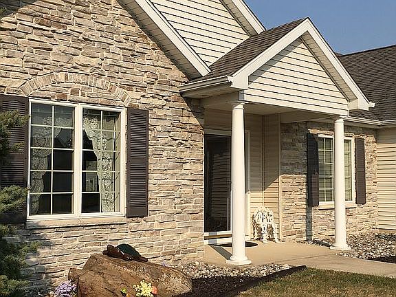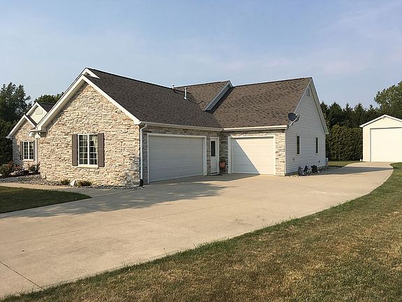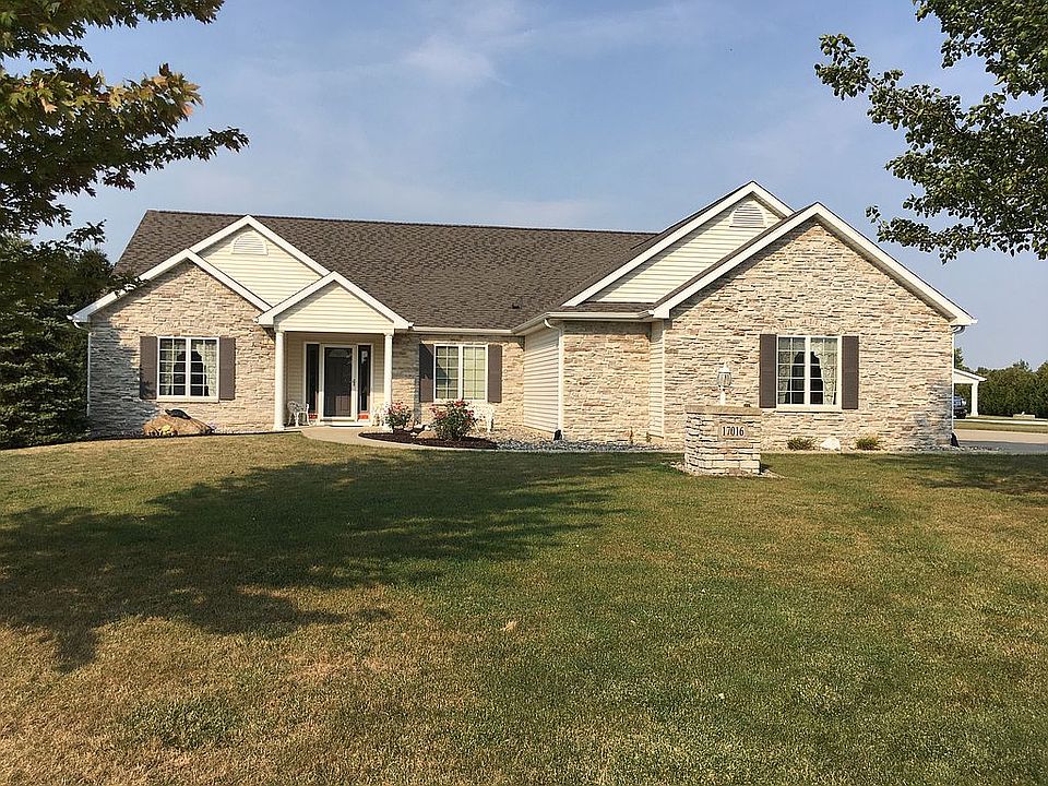 Warm, spacious stone-fronted contemporary in the Hamptons of Woodlan Subdivision. Living here is the best of 2 worlds: near Hew Haven shopping & Amish countryside along the Maumee River. A free-flowing floorplan with a wide wood laminate foyer, double glass doors to a den or third bedroom, sunny formal dining room, living room with cathedral ceiling and high bar seating at the kitchen. A gas fireplace nook opens to a backyard covered patio. A detached insulated 17x43 RV garage with tall electric overhead door can accommodate a 40 feet long RV. This is a perfect home & workplace with three-car garages and a workbench for those who need the extra space to spread out. Many extras: epoxy durable floor finish in garages, paneled RV garage, $7000 generator, three walk-in closets in the bedrooms, two large attic spaces above garages with pull-down stairs & landscaping with boulders.