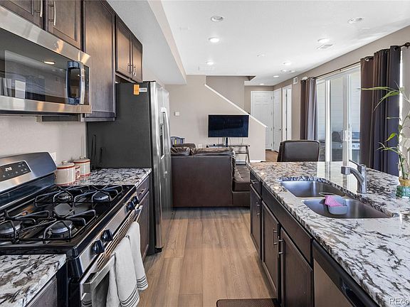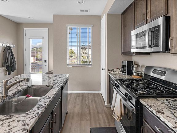 Move in ready like new end unit townhome in parkway point! This 2021 town home has a modern exterior with professionally landscaped front yard, a beautiful cozy porch, perfect for an evening glass of wine! Inside you’ll find an open floor plan perfect for entertaining. A kitchen with upgrades that include modern cabinets, granite counters, stainless steel appliance package, and brushed nickel fixtures. You also have a side patio, perfect for setting up a BBQ grill or just some chairs to enjoy some quiet time. The main floor also includes a spacious living area, a powder room for guests, and an attached 2 car garage. Upstairs you have 3 good sized bedrooms with one being a master suite that includes granite counters, a double vanity, and huge shower. You also have an additional full bathroom that includes designer tile and modern finishes. Great location with easy access to I-225, DIA, and all the options at Aurora Town center!