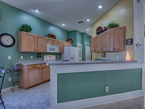 STONECREST 55+ adult gated golf course community. Private roads, manned security gates and 2 miles from The Villagesby golf cart as this is a GOLF CART COMMUNITY. Lovely and unique floor plan that welcomes peace and light from the multiple windows french door. 10 foot ceilings through out the home and garage. Open floor plan and split bedroom design. Long driveway and side entrygarage. The openness of the kitchen overlooks the great room as well as the breakfast nook. 42'' Cabinetry in kitchen that is authenticgenuine wood with mineral streaks by AristoKraft. Dining room has built in ''buffet style'' niche and wainscotting. French door leads to openand expansive enclosed lanai with tile flooring. Memory sliding window and screens grace 2 sides of the lanai.