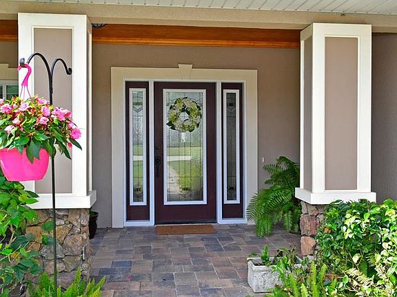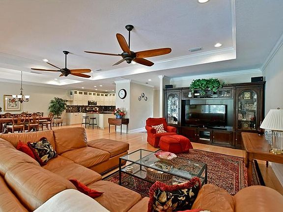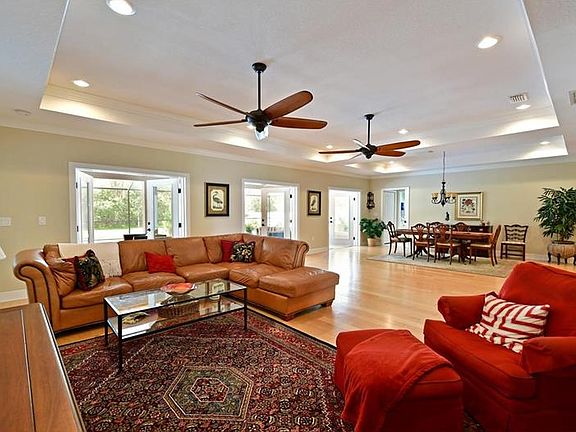 Make this yours...a wonderful custom built home situated on this over ½ acre setting offering an oversized side loading garage with reinforced and insulated attic easily accessible with stairs to store all the extra family things. This home is complete with crown molding, wood flooring, tray ceilings, shutter enhanced hurricane windows and flows easily with an open floor plan. Enjoy meal prep and entertaining in this gourmet kitchen with stone counters, glass backsplash, breakfast island, walk in pantry, solid wood, soft close cabinetry, and SS appliances. The Master suite can accommodate a king size set, and offers walk in closets, garden tub, walk in shower, and dual sinks which allow the owners plenty of space for R&R. The den/library located to the front of the home can be a quiet respite for the work-at-home owner. Guest bedrooms have a spacious footprint enhanced with en-suite bathrooms and stone countertops. The family and dining rooms overlook via French doors onto an expansive screened lanai/porch area complete with large pavers, outdoor kitchen, wood ceiling and lap style salt water pool. Beyond the pool is a partially fenced yard large enough for parties, pets, and swings which faces a wooded or pond backdrop and provides all the privacy needed. Convenience, tons of storage, low fees, highly desirable school district and a move-in ready impeccable home is available at a reasonable price with NO CDDS. Don't wait.
