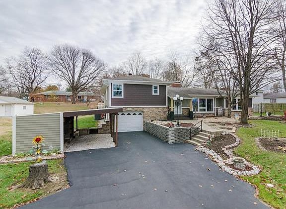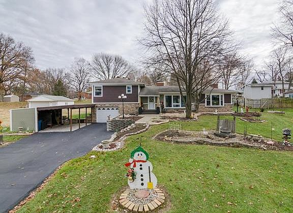 EXCEPTIONAL PROPERTY ON 1/2+ ACRE LOT! Enter the comfy living room with stone fireplace & cove ceiling. Awesome kitchen with arched cooking area, garden window, oak cabinets with refaced doors & slate floor. Large family room with bay window, fireplace/insert, oak mantle & cathedral ceiling. Upstairs you will find an updated hall bath, two additional nice size bedrooms and a large master suite with bay window, wood floor, full bath and jacuzzi tub. Down to the partial basement, enter the rec./pool room for fun activities. Lots of updates include: Trane High Efficiency 95% Furnace & 4 ton XR 15 SEER A/C (2010), SmartBoard siding and stone on house and carport (2015), new wood flooring on stairs and one bedroom, 2 bay windows (2008), new storm front door (2016) and garage door (2008). Beautiful view of yard from the bay windows and 3 season sunroom. Backyard has 2 sheds, playhouse & year round waterfall that stay. Ask agent for additional list of amenities and updates.