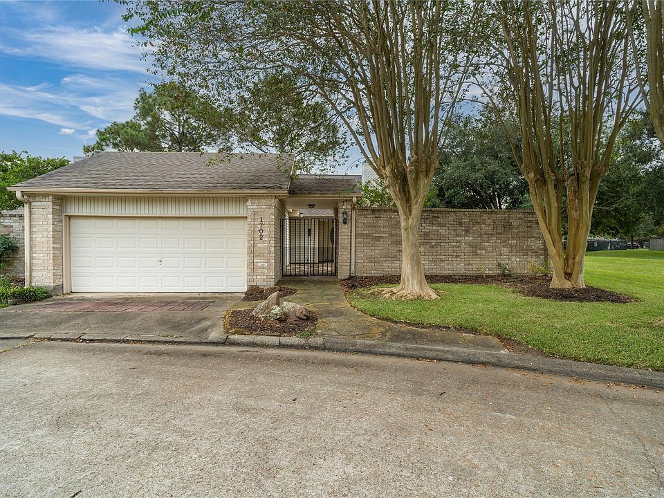 Charming, well cared for patio home on end of cul de sac. This roomy home features exterior gate, and a very nice sized patio off living area and study . The Kitchen is in the back, and has quartz countertops with built-ins all around and very good storage. Replaced appliances. All the living areas have walls of windows, and open up in to a delightful garden area. The three bedrooms are down the hall to the left, and the master bedroom is on the back with a great, open bath which features fresh paint, bowl sinks, and lots of light.the University Green area. The two car garage is in front and it is easily accessible from front door and patio area inside the gate. This area is just out NASA's back gate, and offers great access to shopping, restaurants, and also has easy access to Bay Area for I 45 to Houston or Galveston