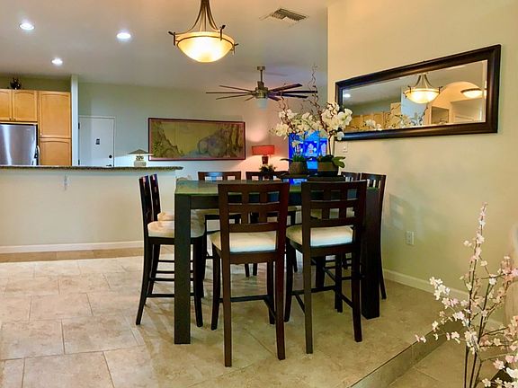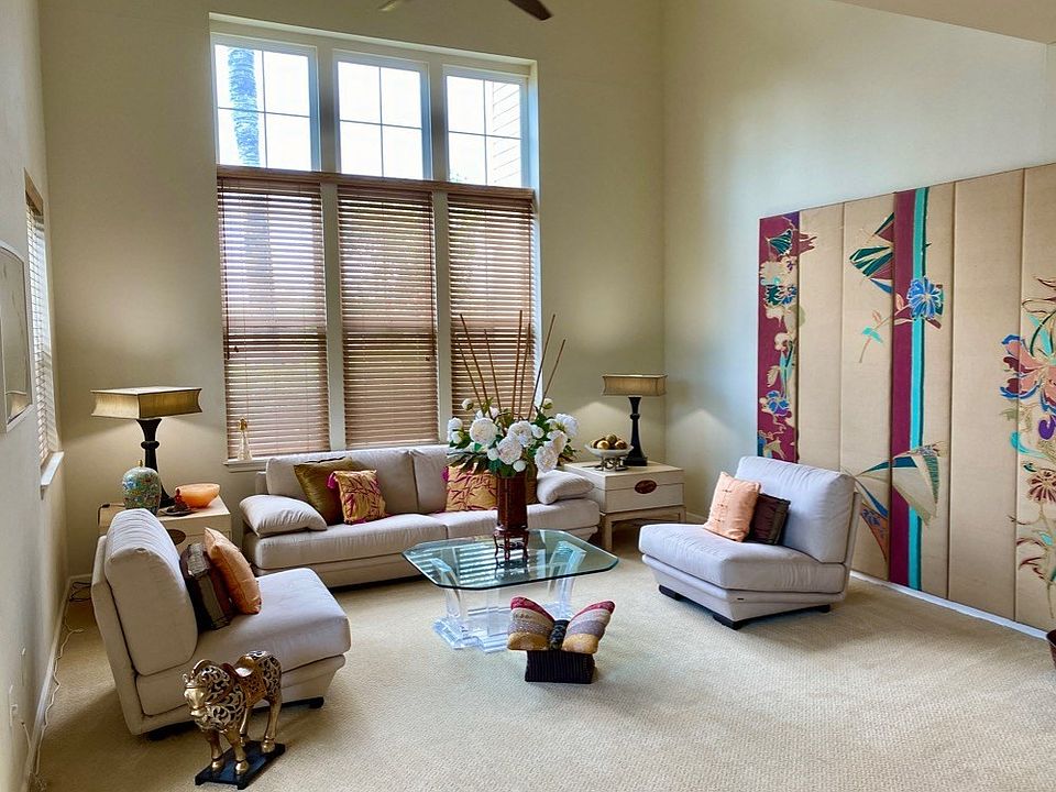 A luxury gated community, Waikoloa Colony Villas is situated along the 10th fairway of the Beach Golf Course at Waikoloa Resort. With the conveniences of a condo and the privacy of a home this comfortable and inviting 1699 s.f., 3 bedroom, 2 1/2 bath is exceptional and rarely offered. In the entry hall there is a roomy storage closet and half bath featuring half wall tiled with travertine and decos. The unit features an open floor plan; living room windows fill an entire wall reaching up to the soaring 17' ceilings allowing the sun to flood the area with natural light. With a floor that looks like natural wood but is actually tile you'll find the room to be striking even before you add your furniture and decorating touches. From both the living and dining area a sliding door provides access to the covered lanai where you can enjoy the immaculate garden area; perfect for outdoor dining. The kitchen has plenty of cabinet space, upgraded tile backsplash, granite countertops, and large stainless steel fridge. Enough room for a large dining table adjoins the kitchen area or use as a family room. The upstairs primary bedroom easily accommodates a king sized bed, with walkin closet, an ensuite bath with a double vanity, soaking tub and glass enclosed shower. Off the primary is another covered lanai to enjoy the cool evening breezes with views of the mountains. Two additional bedrooms will provide space for queen sized beds and are also perfect for a home office, library or play room. There is a full hallway bathroom and a stackable full sized washer dryer in the laundry area. The single car garage offers a convenient entry to the kitchen, recently replaced hot water heater and fresh floor and wall paint. Waikoloa Resort has two shopping centers with restaurants, grocery store, shops, gas station and lots of outdoor water activities to enjoy. The maintenance fee includes water, internet, pest control, cable, trash, two workout rooms, two pools, tennis court, bbq, spa.