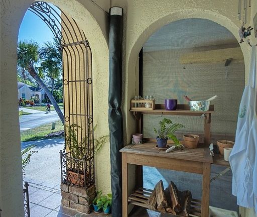 Charming and beautifully maintained villa in Terraverde. Designed and decorated to feel like a garden villa in the countryside, this unique and thoughtfully updated home is like no other in the community. Private covered porch entry leads you to 3 full bedrooms set w/ a Murphy bed for dual purpose office and workout space. Beautiful 12"x24" tile laid in a herringbone pattern throughout the entire home. Vaulted ceilings with shiplap tongue and groove provide drama to the kitchen and greatroom and a feeling of space and light. The kitchen has generous cabinetry and counter space, pantry storage and stainless appliances. The well laid out owner's suite features a luxury bath with custom shower and cabinets, excellent storage space and closets. Step out the back to your sanctuary garden - covered patio seating, paver court area, beautiful tropical plants, patio seating on the side yard, and even an outdoor shower. Covered attached parking. NO FLOODING or STORM DAMAGE. Terraverde has great amenities and low fees! Boat launch on site with gulf access and great fishing. Renovated clubhouse, pool, pickleball, tennis and restaurant included! Golf is public with membership options