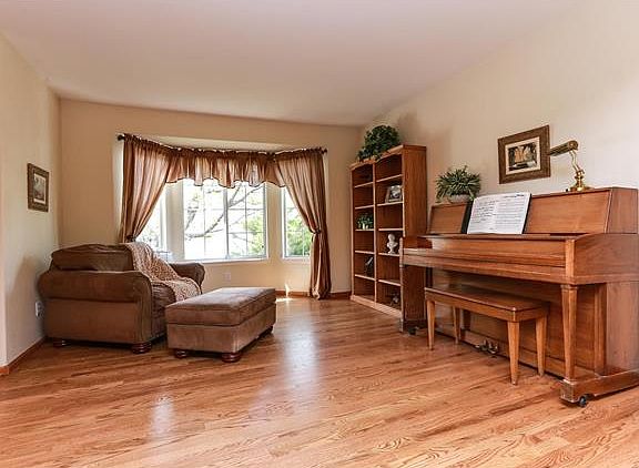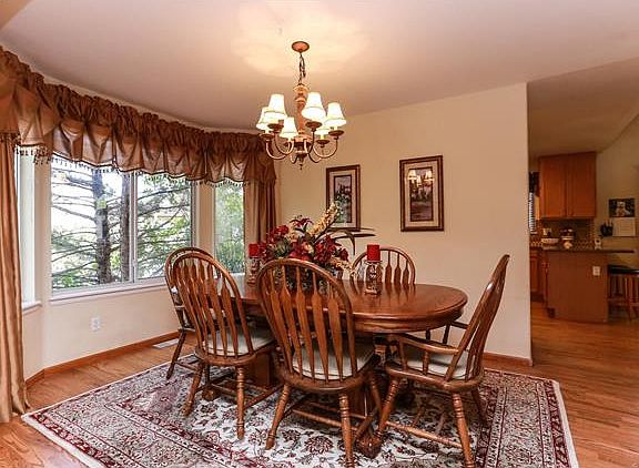 Popular floorplan features four beds up, a three car garage, finished basement and backs to the green space! Step inside the foyer to hardwood floors that extend into the formal living and dining rooms, through the kitchen and eating space and into the vaulted family room. Updated kitchen features slab granite countertops, 42" upper cabinets and stainless steel dishwasher and smooth top range. Relax on the deck and enjoy the fountain in the lush and private backyard with no neighbors directly behind! Master suite has five piece bath with tile floors and good sized walk-in closet. Finished basement features an open rec area that is perfect for entertaining. Newer roof and gutters, some newer windows, large storage shed! Located in a pool community near schools, shopping and walking path.