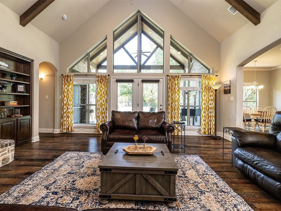 Discover this custom-built home on nearly 5 acres at the end of a cul-de-sac in PARKER County. Downstairs primary bedroom offers convenience and privacy, complemented by two living areas, a media room, and an open concept design. The kitchen features a large island, granite countertops, knotty alder cabinets, and a spacious pantry. Additional highlights include a built-in office, mud room, and a laundry chute.The master bath boasts a walk-in shower and double vanities. Upstairs, enjoy panoramic views from the large balcony. The home features large bedroom doors and is equipped with a whole-home audio and ethernet system, plus a security system with cameras. Outside, find a 22 x 28 shop with electric, a loft, additional 10x16 shed, and a serene pond at the back of the property. This exquisite home is ready to welcome you!