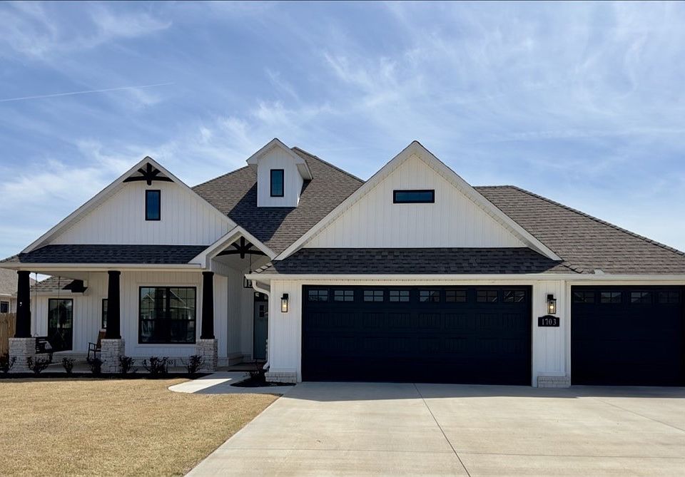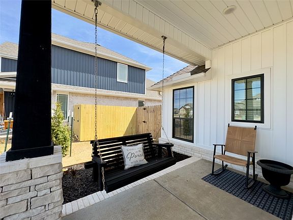 This stunning home boasts a modern farmhouse exterior in crisp white with sleek black trim. Step onto the inviting covered front porch, complete with a porch swing for relaxing. A grand entry welcomes you with ample natural light & a beautiful barrel ceiling. The bright living room features a cozy gas fireplace- perfect for gatherings. The chef's kitchen is a dream, complete with a gas cooktop and custom quartz countertops. Plenty of cabinet space and a walk-in pantry! The master suite offers a luxurious escape with a huge soaker tub and a custom-tiled walk-in shower. With four bedrooms and two and a half baths, this home has all of the space you need. Park all of your vehicles in the three-car garage. Enjoy the outdoors on the extended back patio, surrounded by a wood fence for privacy. This home is the epitome of modern farmhouse living, with its beautiful design and thoughtful amenities. Be sure to check the virtual tour and then schedule a showing in-person!