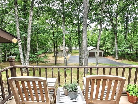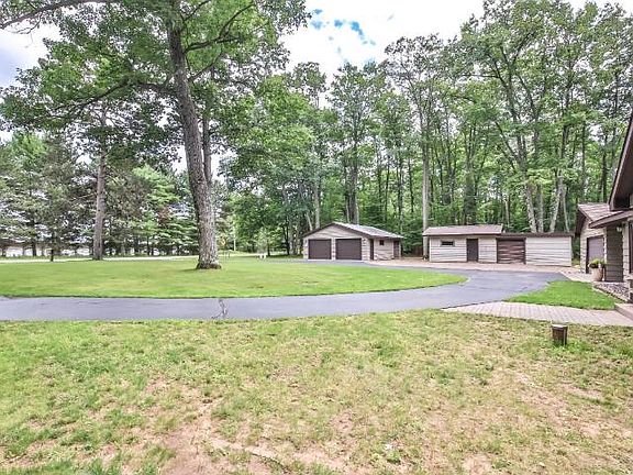 Towering oak trees create a beautiful canopy over this property that supports a main home, 2 detached garages, a workshop and is completed with a charming 2 bedroom, 1 bath cabin. The cabin offers a full kitchen, a large screened in porch and wood burning fireplace. The black top circle drive shows off the main home with a 2 car attached garage, a three season porch and a lakeside deck. 3 bedrooms with 2 baths and a wood burning fireplace allow plenty of room for the whole family. The golf cart path to the pancake flat, sand beach frontage is the perfect place for yard games and roasting s'mores over the fire. Abundant storage, close to town, mature trees and a full rec lake makes this property a perfect fit for all.