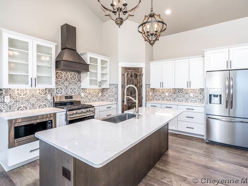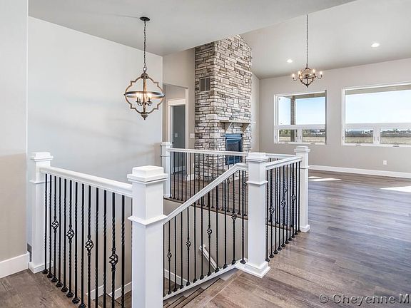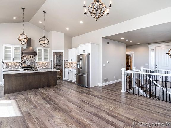 Woods Brothers custom ranch home in Bell Pasture with exquisite attention to detail throughout. Stunning gourmet kitchen with 48' range and hood vent, Open great room with vaulted ceilings, hardwood floors, a large deck with views of Rockies Mountains. Abundance of natural light with Full glass front door open to the 8 foot by 12 foot sliding glass doors to the back deck on the main level. Walkout basement feels light and bright with the second 8x12 foot sliding glass door. Unique custom finishes throughout this Woods Brothers Construction home! Valted ceilings, Gourmet kitchen with 48” gas range with double ovens, and vented hood, white cabinets and light colored countertops & pantry. Master suite with five-piece master bath with freestanding bathtub and door to the covered patio. Upgrades include 50 year shingles, air conditioning, fully finished 4 car garage with insulated and drywalled with texture and painted, 8 foot solid doors, Unfinished walkout basement, vault in basement, covered front patio and composite covered desk in the back, insulated garage door with R -value of 13 and wifi compatible garage door openers. All this and in Lovely Bell Pastures, just North of Cheyenne and right off of I-25 with paved road and fiber high speed internet!