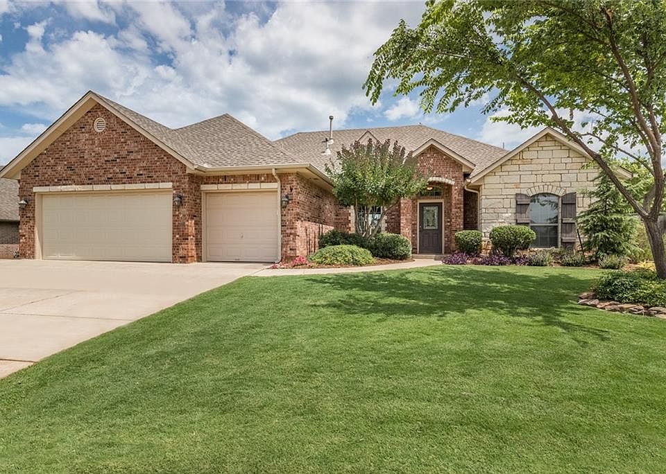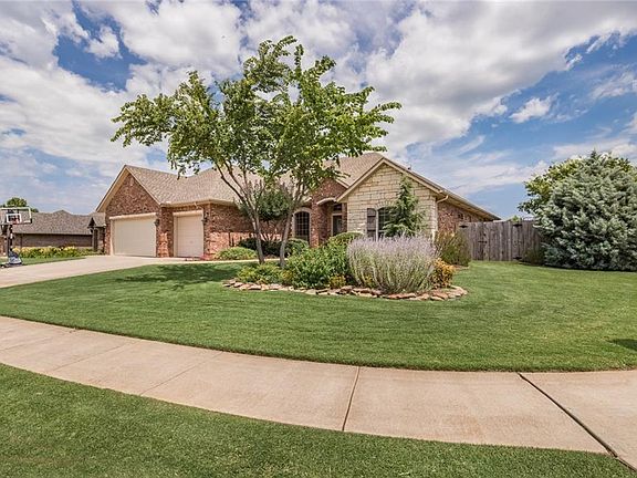 HERE IS YOUR NEW HOME IN DEER CREEK! This home has 4 beds and 3 full baths! The fourth bedroom could be used as a study. Gorgeous views to the landscaped backyard with a large covered patio.There is also a view of the pond with fishing and a walking trail. Kitchen Stainless steel gas range and dishwasher, lots of cabinets and granite counter tops. All of the bedrooms have walk-in closets, fresh paint and new carpet. Master suite has a bay window, walk-in shower and whirlpool tub and double vanities. Wood floors in spacious family room. LOADED WITH STORAGE! Large 3 car garage with storm shelter below ground and a storage building in the back yard.