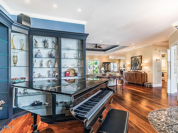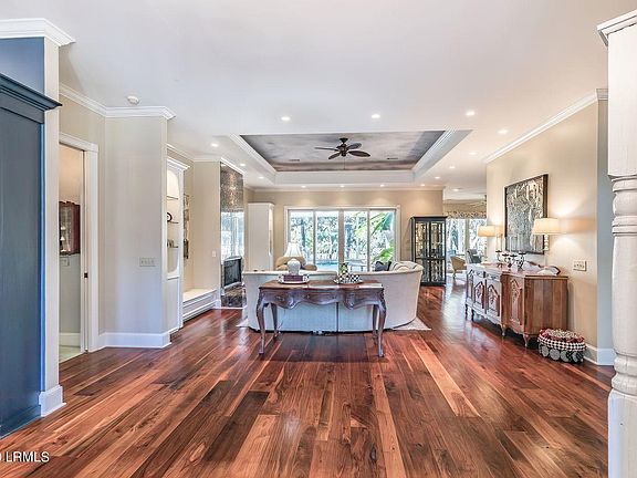 Casual elegance with an open floor plan. Welcome to this extraordinary marsh front home on beautiful Dataw Island. This open design, single level, custom home features 11' ceilings and walnut hard wood floors throughout. As you enter the foyer, you are greeted by both an elegant sitting area/piano room with customized built-ins and the ambiance of the Great room with gas fireplace, tray ceiling, and built-in cabinetry. Through the Great room sits the large custom kitchen with abundant storage and center island which flow nicely into a casual eating area. A separate formal dining room with a wall of windows and a 20-foot-high accented ceiling is perfect for family gatherings. The primary suite includes a large walk-in closet, jetted tub, shower, vanities, and water closet. A guest wing