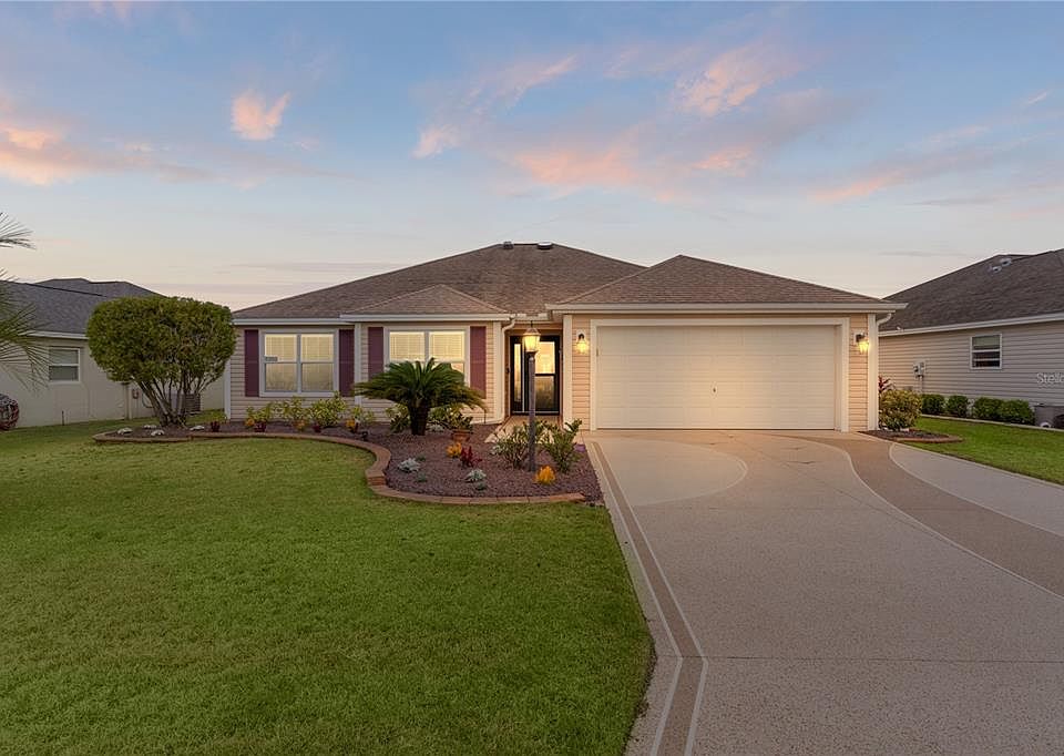 *** PRICE CHANGE *** THIS HOME is ready for you! Don’t miss out! GREAT LOCATION!!! This 3-bedroom, 2-bathroom Whispering Pine model in the coveted village of HILLSBOROUGH is a true gem. Curb appeal abounds with a NEWER (2022 est) decorative stained driveway, low-maintenance landscaping leading to the covered front entry. Laminate flooring adorns the living and dining rooms. The large eat-in kitchen is well-appointed with STAINLESS STEEL appliances, including a refrigerator, and microwave. The kitchen is light and bright with a SOLAR TUBE. From the kitchen dining area step into the lovely lanai with FULL LENGTH SLIDING WINDOWS with an outside pavered patio perfect for entertaining. Also off the kitchen is an inside LAUNDRY ROOM with cabinets and sink. Garage has beautiful EPOXIED FLOORS (2022 est) with lots of shelving, and pull down attic stairs. The ensuite bathroom features a walk-in shower and oversized vanity area. Guest Bedroom with closet leads to hall with linen closet & guest bath with tub/shower combo. Conveniently located between Lake Sumter Landing and Brownwood Squares. This residence presents a unique opportunity for comfortable living in the heart of The Villages. A TURNKEY package is available. A 2018 Gas Golf Cart is also available for purchase.