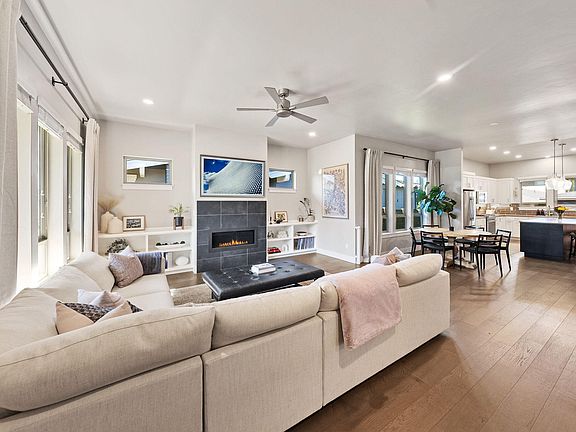 Highly sought-after single-level Prairie-style home in the heart of Northwest Crossing! This light-filled open floor plan features hardwood floors, a modern gas fireplace, and custom built-ins. The spacious kitchen includes a large island, quartz countertops, and stainless steel appliances. Enjoy 10' ceilings with upgraded LED disc lights featuring a nightlight function. The primary suite boasts a walk-in closet, tile shower, and double vanity. Step outside to a fully fenced backyard with a covered patio—perfect for gatherings or quiet evenings—plus a charming front patio for morning coffee. Smart irrigation in both front and back yards. Functional laundry room with sink and built-in cabinets, Hunter Douglas window treatments, and oversized 2-car garage plus 3rd driveway space. Minutes from Discovery Park, schools, coffee shops, restaurants, bars, and the vibrant summer Saturday market. A perfect blend of peaceful living and Bend's best amenities.